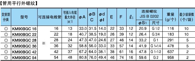·關(guān)于表中的※1標(biāo)記,可插入電纜的最大外徑是以本體最小內(nèi)徑為標(biāo)準(zhǔn)的。電纜穿過(guò)90°型本體部時(shí),因電纜原因有不能穿線的情況,所以請(qǐng)以最大外徑的40-60%的外徑作為基準(zhǔn)。