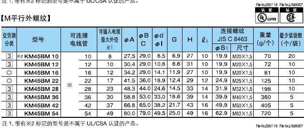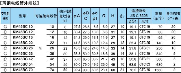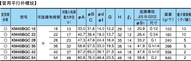 ·金屬軟管與配電盤等嵌入連接用的45°形接頭。 ·表中的[可連接金屬軟管]欄內的※號,代表KMS、KMV、KPF、KIC、KIH、KIV、KPBF、KUU、KCS、KMB、KIB、KM、KI。 ·金屬軟管與接頭的拉伸強度,#10尺寸為500N(JIS中級),#12-54尺寸為1000N(JIS高級),#70尺寸以上為2500N(JIS超高級)。 ·關于表中的※1標記,可插入電纜的最大外徑是以本體最小內徑為標準的。電纜穿過45°型本體部時,因電纜原因有不能穿線的情況,所以請以最大外徑的40-60%的外徑作為基準。 (在網站“下載中心”里可以下載產品PDF文件)